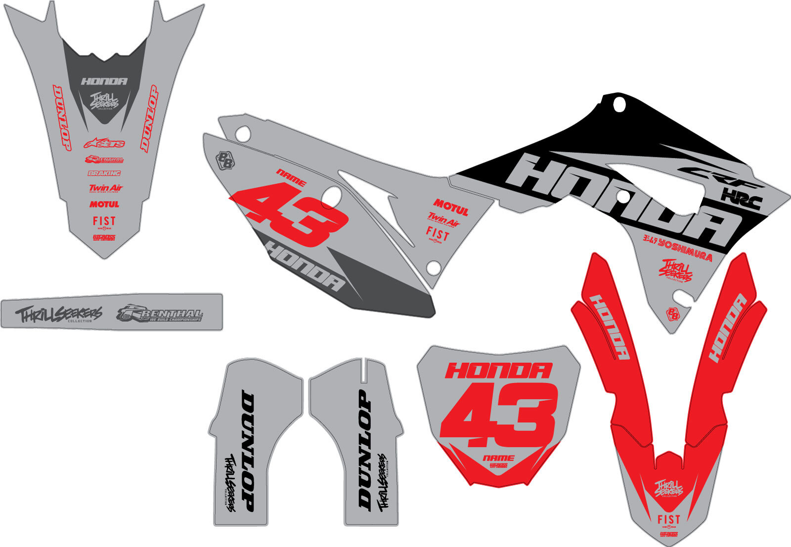 DESCRIPTION: All Full HONDA SLASH GREY 50cc motorbike sticker kits can be customised with your Name / Number and Choice of logos. Fill out the details above and we will get to work on modifying the design to your specifications.If you like the design of this kit but want to change colours around we can do this free of charge just let us know in the comments section. Number styles can also be specified in this section.