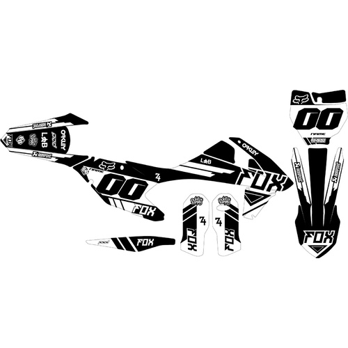 Please note that the designs shown are for illustration purposes only and whilst we endeavour to keep as close to these as possible logo placements may change slithtly due to the differences in modles and the angles of the plastics. Graphics kits do not include plastics, seat covers, mid forks or the bike.