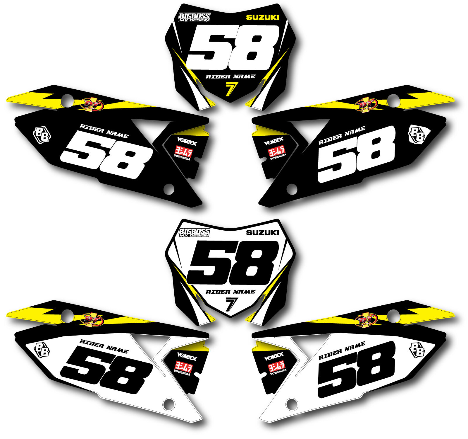 SUZUKI 65cc and "SEVEN" STYLE mx number plate decals can be customised by adding your selection of industry logos or your own company logos (Artwork for company logos must be supplied in a useable format ai eps or original artwork pdf's) You can change the colour on these motorbike number plates to suit your specific race class or simply the preference you desire. Full proofs will be sent prior to printing at no extra cost.